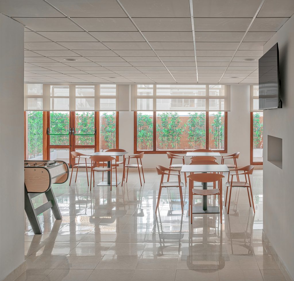 Durante el año 2023, hemos renovado el mobiliario de interior de la cafetería, ampliándola para ofrecer a nuestros huéspedes más zonas de esparcimiento. Esta nueva y luminosa área de ocio del hotel cuenta con diversas pantallas de TV, Mesa de ping pong y futbolín